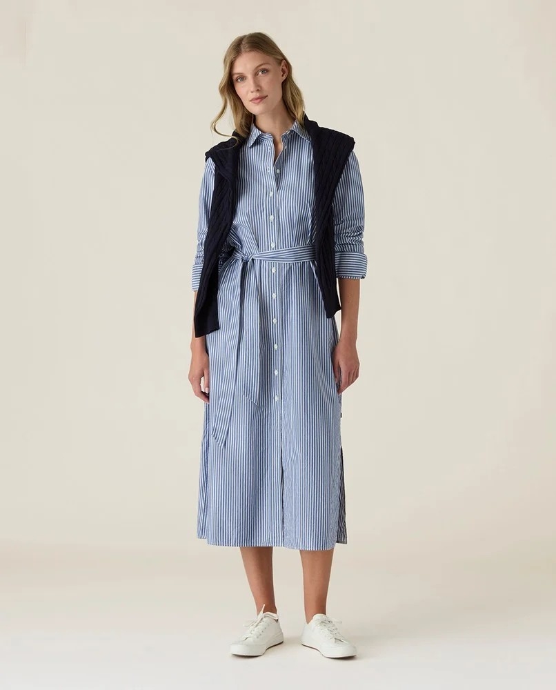 Denne elegante skjortekjolen kombinerer et tidløst stripemønster med en avslappet og feminin silhuett. Laget i en myk og lett blanding av bomull og lyocell, føles kjolen behagelig mot huden og gir god komfort gjennom hele dagen.
