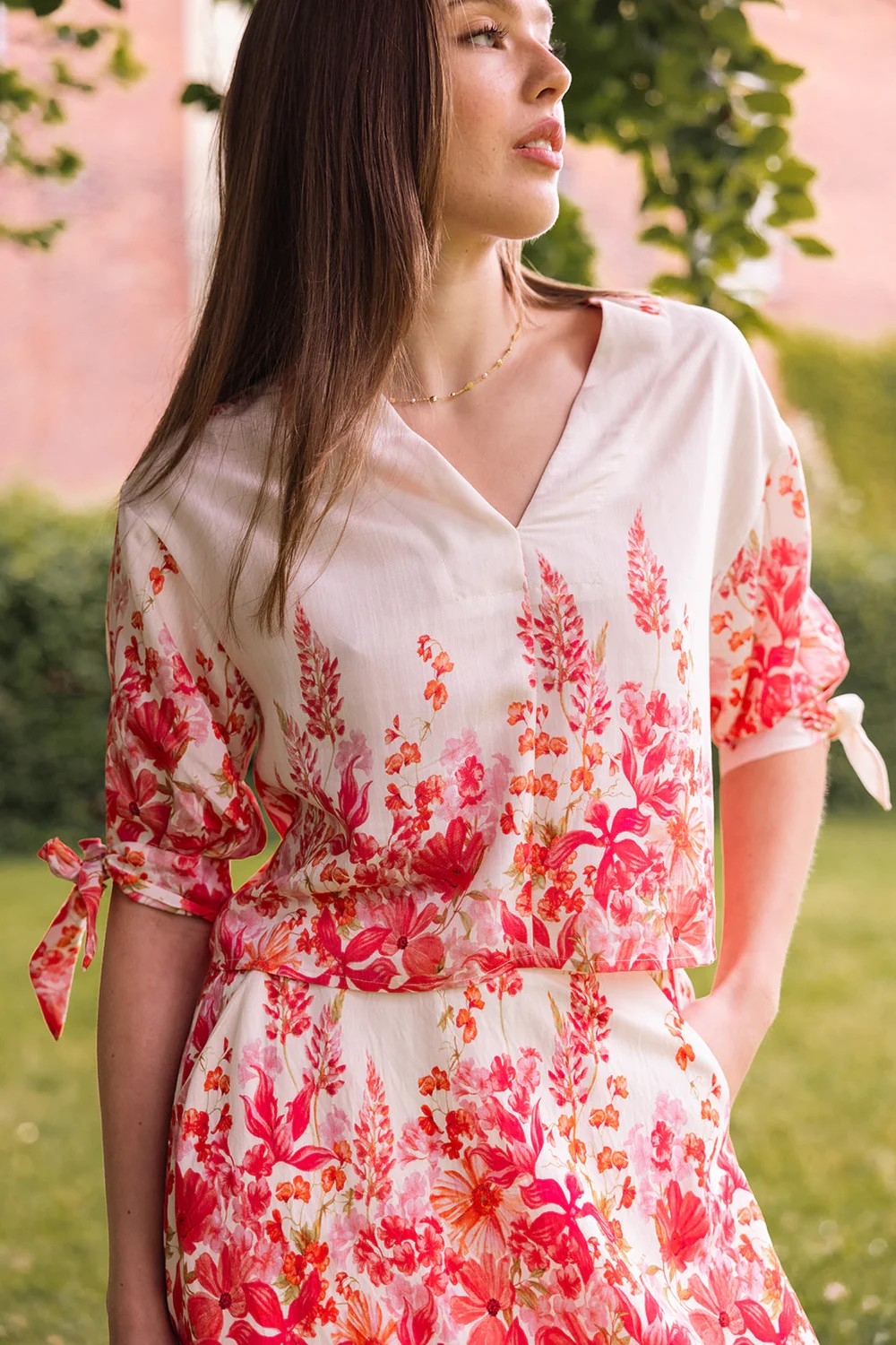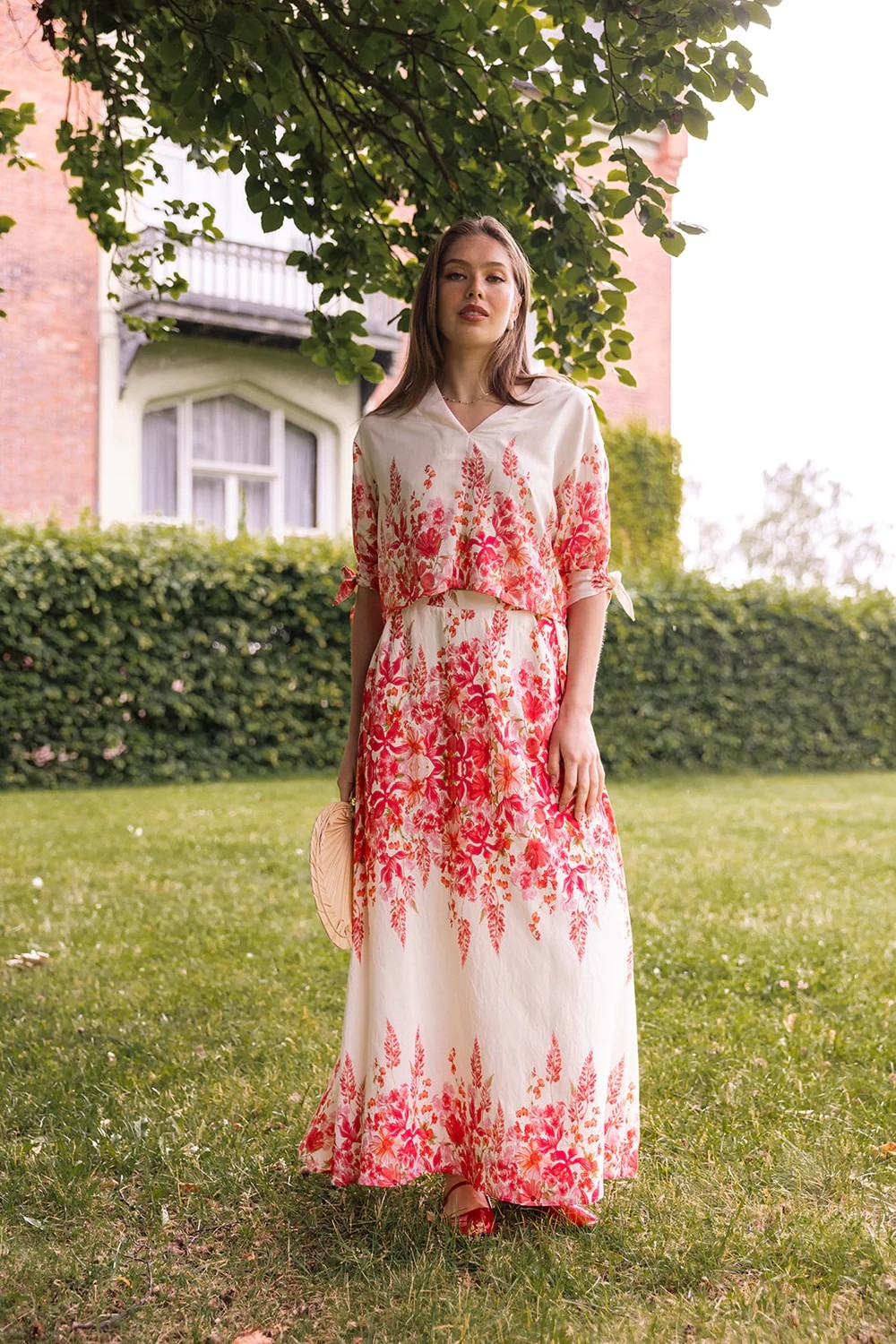 Et luftig og feminint maxiskjørt med vakkert blomsterprint i varme rød- og rosatoner. Elea Skirt kombinerer komfort og eleganse – perfekt til både sommerfester og avslappede soldager.