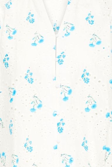 En romantisk og sommerlig bluse med blå blomster på hvit bunn. Ela bluse kombinerer klassiske linjer med delikate blondedetaljer – like fin til hagefest som til en helt vanlig hverdag.