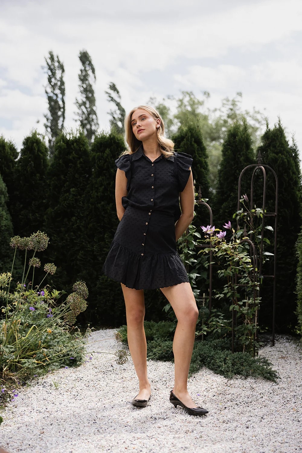 Et lett og romantisk skjørt med feminine detaljer og kort lengde. Elodie Skirt kan styles som sett med Elodie Blouse – eller alene for en avslappet og sommerlig look.