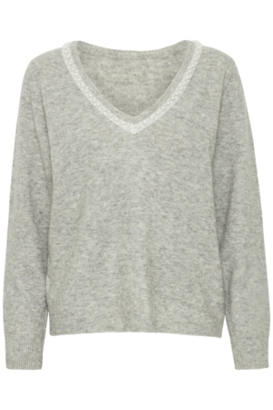 Denne elegante v-genseren kombinerer klassisk design med feminine detaljer. Den myke, grå strikken har en flatterende V-utringning dekorert med delikate perler som gir genseren et sofistikert og eksklusivt uttrykk – perfekt både til hverdags og mer pyntet