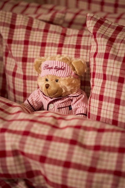 • Tradisjonell og sjarmerende høytidsbamse med rød/hvite oxford-pyjamas og søvnmaske