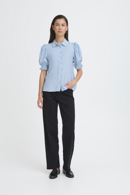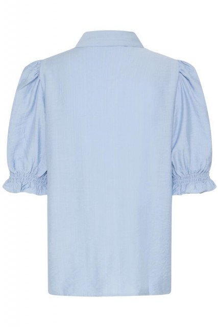 Blusen har korte puffede ermer med elastisk avslutning som gir en myk og romantisk silhuett. Klassisk krage og knappestolpe i front gir et rent og gjennomført uttrykk, mens den lette viskoseblandingen gjør den behagelig og luftig mot huden.