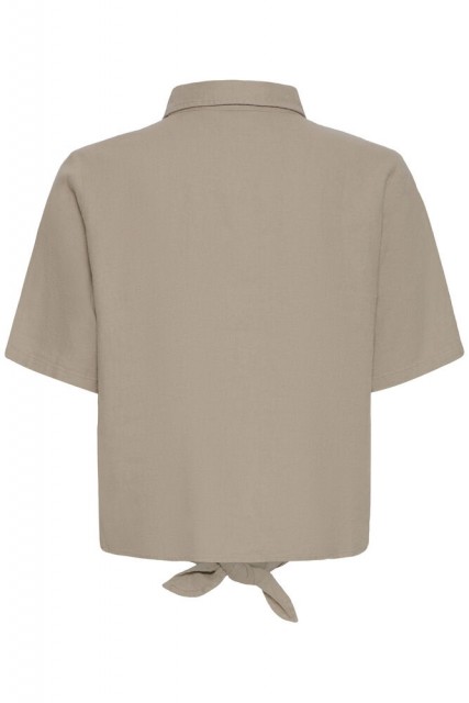 Skjorten har korte ermer, klassisk krage og knapper i front, samt en feminin knytedetalj nederst som gir en moderne og uanstrengt silhuett. Den lette kvaliteten gjør den behagelig å bruke på varme dager, samtidig som den faller fint og gir et rent uttrykk.