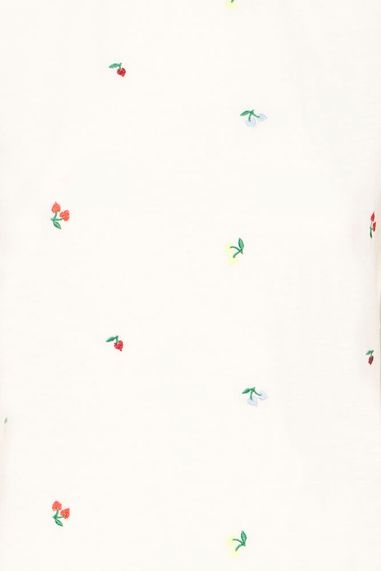 Dette er en klassisk t-skjorte med et lekent og feminint preg. Den lyse kremfargen gir et rent og tidløst uttrykk, mens de små broderte blomstene gir plagget en sjarmerende og sommerlig detalj.