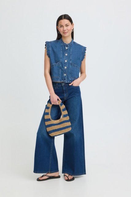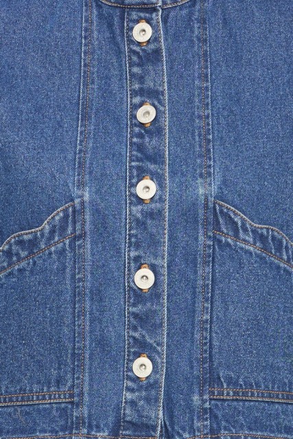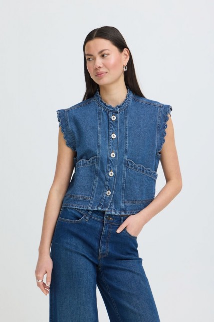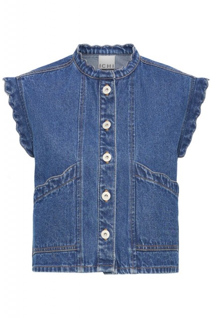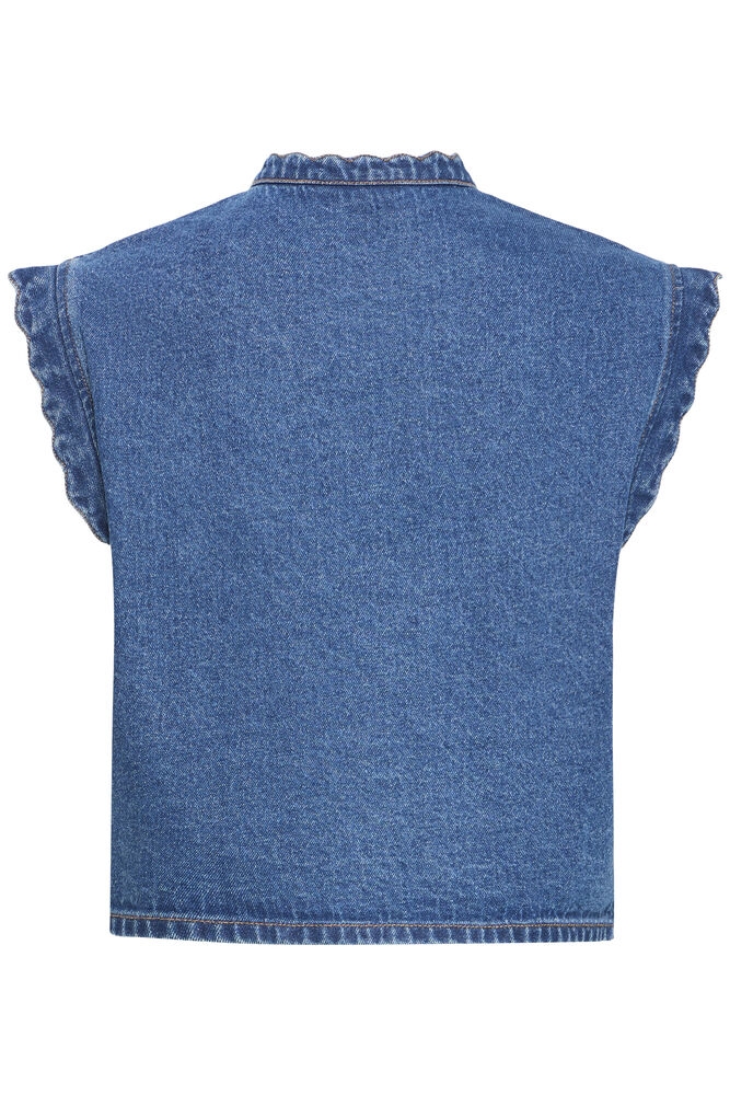De feminine volangdetaljene langs ermene og halsen myker opp den klassiske denimlooken, og knappene foran gir et gjennomført, stilrent preg. Den mørkeblå vasken gjør toppen enkel å kombinere – enten du går for en hel denim-look eller styler den med lyse sommerplagg.