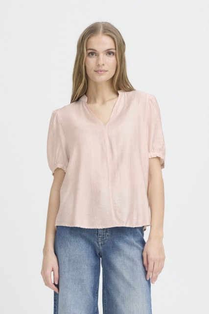 Blusen har korte puffede ermer med elastisk avslutning som gir en lett og feminin silhuett. Den åpne V-utringningen gir et rent og moderne uttrykk, mens den lette viskoseblandingen gjør den behagelig og luftig mot huden.