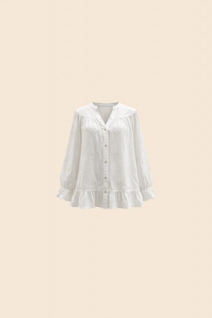 Den har en flatterende V-hals med knappelukking foran, og vakre broderier med paisley-inspirasjon som gir blusen et eksklusivt og gjennomført uttrykk. De subtile volangene nederst tilfører en lett og romantisk finish, mens de lange ermene med mansjett balanserer helheten på en elegant måte.
