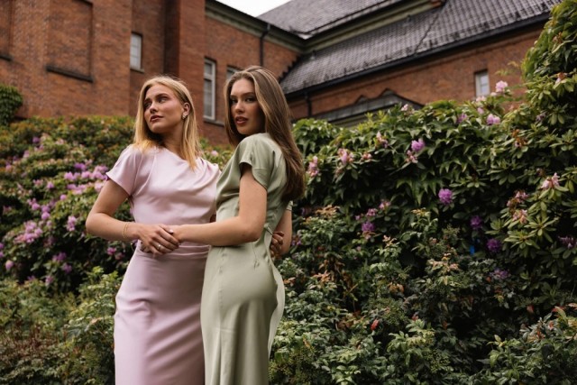 Den delikate sage green-nyansen gjør kjolen både tidløs og moderne – like perfekt til bryllup og sommerens festligheter som til en mer formell middag.