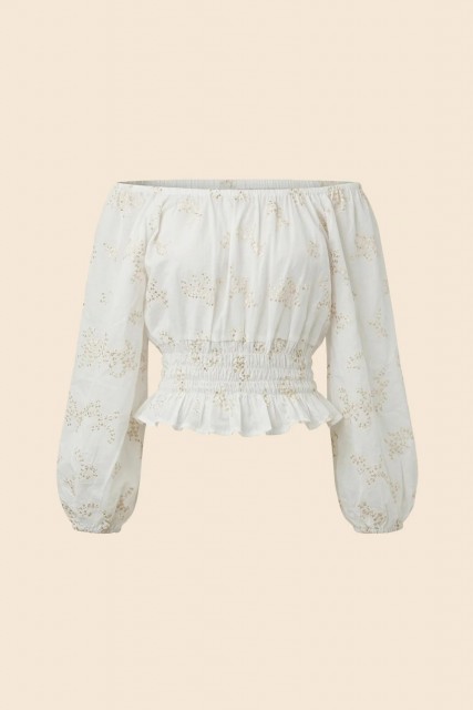Giselle er en romantisk og iøynefallende topp med et lett og feminint uttrykk. Den hvite fargen kombinert med små gullpaljetter gir et delikat shimmer som fanger lyset på en vakker måte.