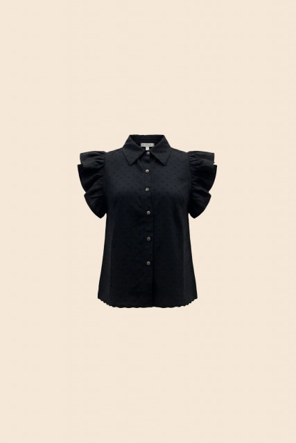 Den har en tidløs skjortekrage og knappelukking foran som gir et rent og gjennomført uttrykk, mens de korte, doble volangermene tilfører myk bevegelse og en feminin detalj. Den broderte strukturen i stoffet gir blusen dybde og et eksklusivt preg.