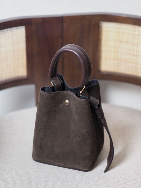 Bøtteveske i semsket og glatt skinn