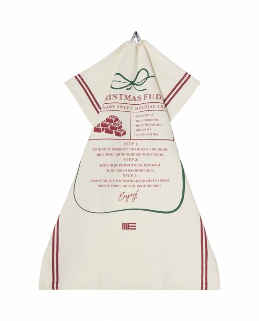 Dette sjarmerende kjøkkenhåndkleet bringer både funksjon og juleglede til kjøkkenet. Laget av myk økologisk bomullstvill, prydet med en trykt fudge-oppskrift i en munter palett av hvitt, rødt og grønt, er det både et dekorativt blikkfang og en praktisk hjelper i julebaksten. De garnfargede stripene på sidene tilfører en klassisk detalj, mens det vevde Lexington-hengermerket gir et eksklusivt preg.