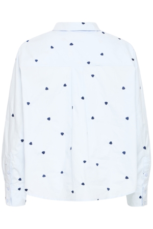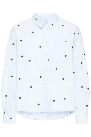 Trendy skjorte fra ICHI i lys blå med søte mørkeblå hjerter. Klassisk design med krage, knappelukking og brystlomme. Normal passform med avrundet kant gjør den enkel å style både til hverdags og jobb.