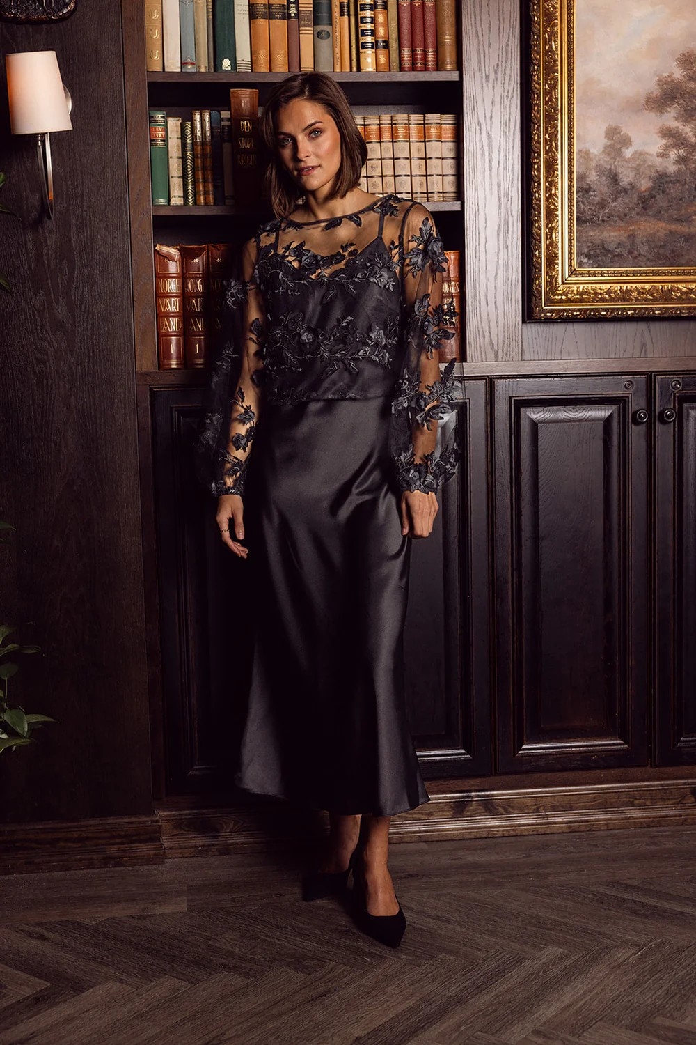 Molly Blouse er en elegant og iøynefallende bluse som kombinerer transparent tulle med intrikate blomsterapplikasjoner.
