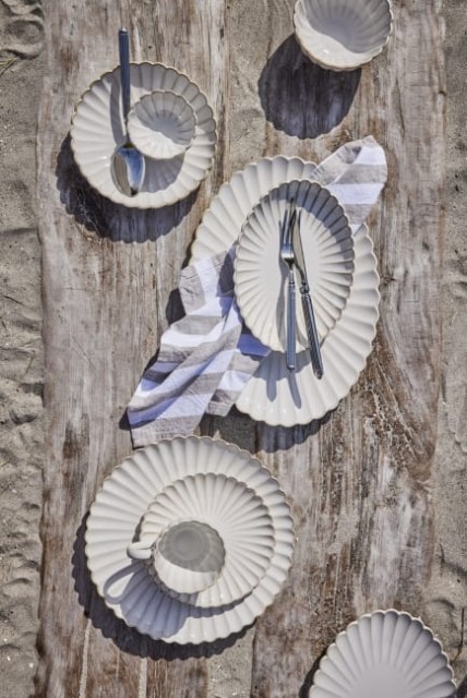 Det unike designet med delikate nyanser av elfenben og beige gir et mykt, feminint uttrykk som skaper en vakker borddekking.