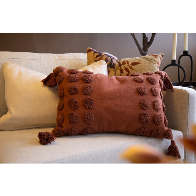 Puten har rektangulær form og er dekorert med lekre dusker i hvert hjørne – en detalj som gir den det lille ekstra. Perfekt i sofaen, på sengekanten eller i en lenestol hvor du ønsker å tilføre varme toner og taktilitet.