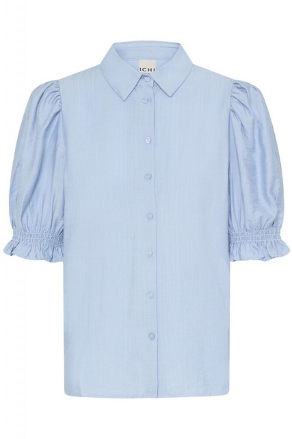 Blusen har korte puffede ermer med elastisk avslutning som gir en myk og romantisk silhuett. Klassisk krage og knappestolpe i front gir et rent og gjennomført uttrykk, mens den lette viskoseblandingen gjør den behagelig og luftig mot huden.