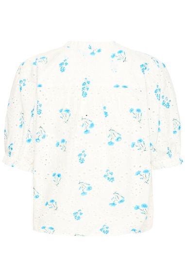 Dette er en romantisk og luftig bluse som gir antrekket et friskt og feminint uttrykk. Den lyse kremfargen kombinert med små blå blomster skaper et lett og sommerlig preg som passer perfekt til både hverdag og hyggelige anledninger.