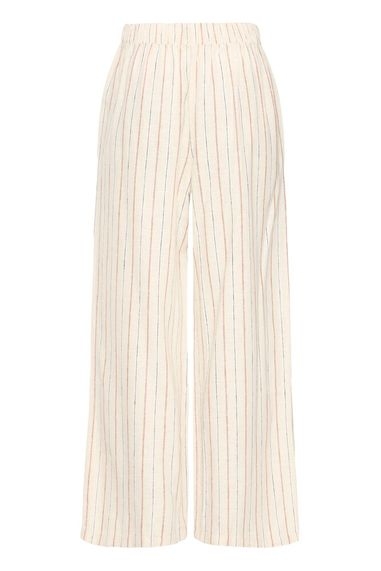 Linno er en komfortabel og tidløs bukse med et avslappet og moderne uttrykk. De lyse tonene kombinert med brune striper gir et friskt og naturlig preg, som gjør den enkel å style til både hverdags og ferie.