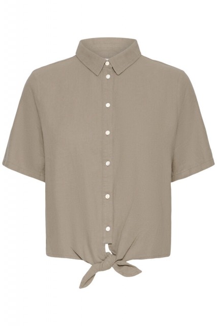 Skjorten har korte ermer, klassisk krage og knapper i front, samt en feminin knytedetalj nederst som gir en moderne og uanstrengt silhuett. Den lette kvaliteten gjør den behagelig å bruke på varme dager, samtidig som den faller fint og gir et rent uttrykk.