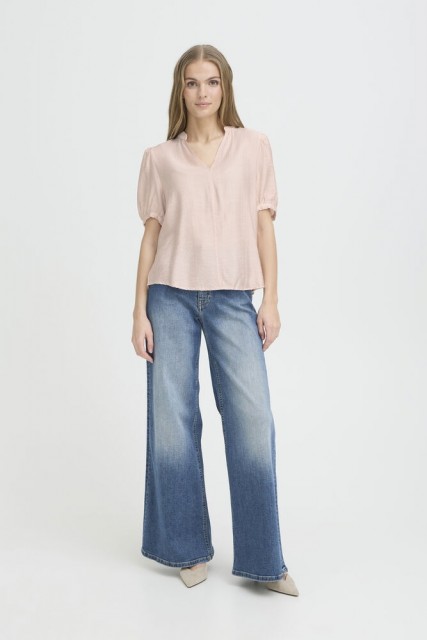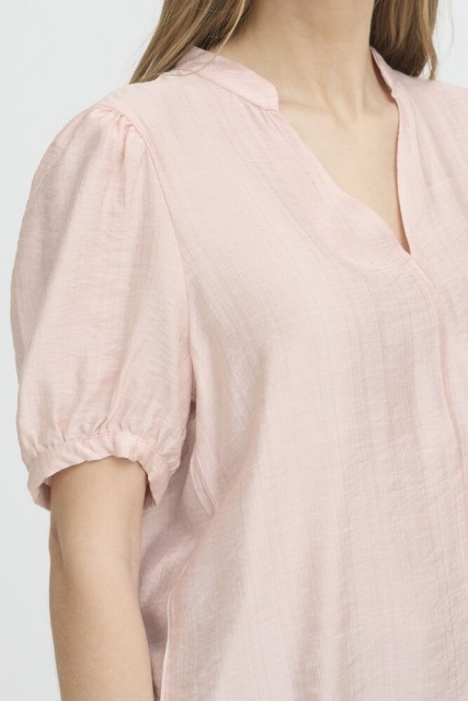 Blusen har korte puffede ermer med elastisk avslutning som gir en lett og feminin silhuett. Den åpne V-utringningen gir et rent og moderne uttrykk, mens den lette viskoseblandingen gjør den behagelig og luftig mot huden.