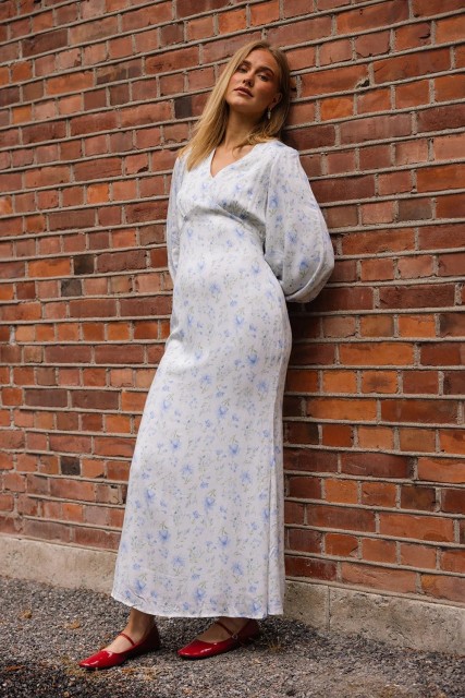 Det delikate blomsterprintet i lyseblå og grønne toner mot kremhvit bunn gir et mykt og harmonisk uttrykk. Den ankellange/maxilengden gir vakker bevegelse når du går – en kjole som føles like fin som den ser ut.